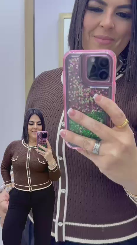 Presenta un diseño bicolor con ribetes contrastantes, botones decorativos al frente y bolsillos simulados, que aportan un toque sofisticado y femenino. Es una prenda versátil que puede utilizarse tanto para un look casual como para una ocasión más formal.